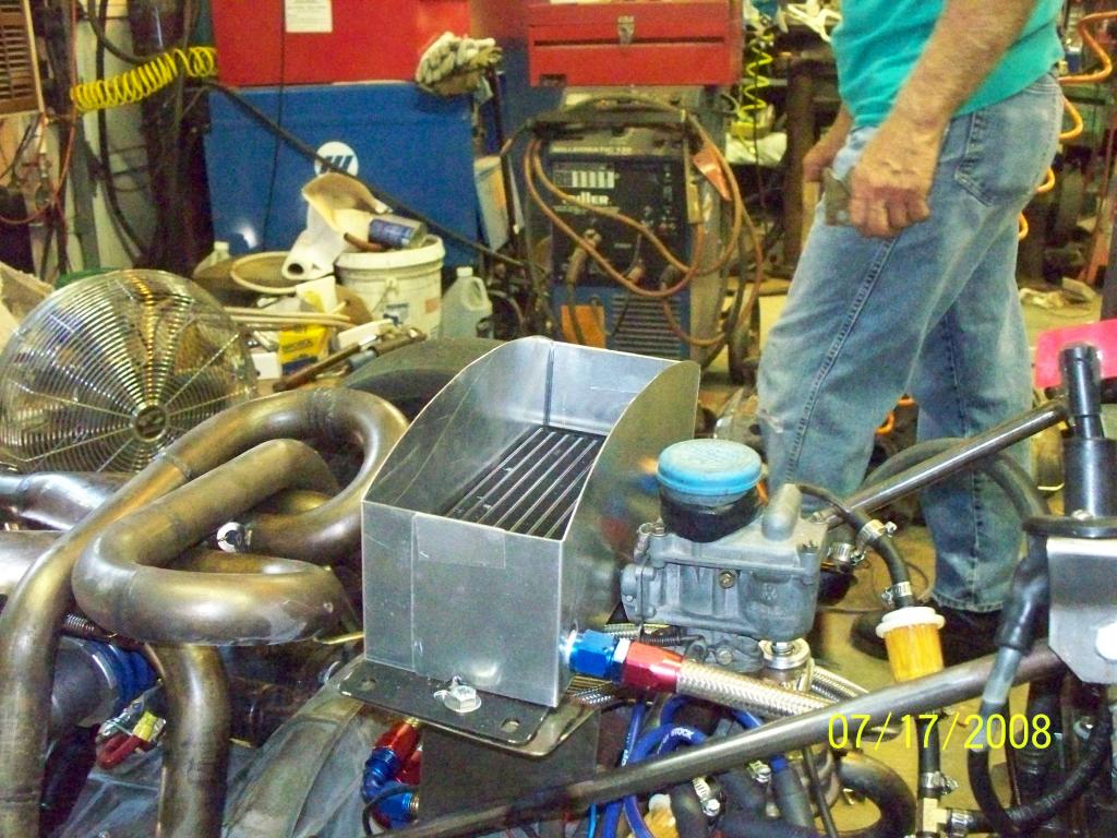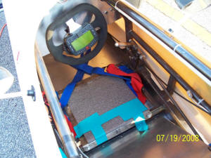 We had 3 sessions during the day. A qualifier, a qualifying race and then the 'real' race. There was almost enough time between them for me to get about 1/10th of the things done that I needed after each session. The first one was pretty good for the first time out. I started off pretty slow and gradually picked up the pace. I noted MANY 'issues' with me fitting into the car, visibility, etc, but the car seemed to 'work' OK. One MAJOR problem was the head temps were way too high - over 500 degrees !! For the second session, I repositioned myself in the car a bit, added some bolsters to keep me from rolling around too much, and worked on the scoops to the heads to reduce the amount of air that was being lost due to my poor workmanship on the ducts.