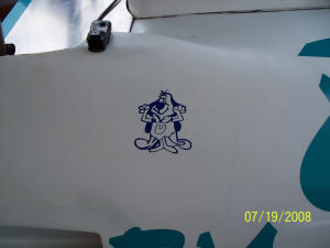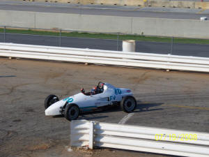 The next session was a good bit better. My mirrors were vibrating too much, the steering wheel too close to the front roll hoop (bloodied my knuckles through the gloves) - made it a bit tough to steer when I really needed it most. Several other items as well, but we went a little faster and I noted no real PROBLEMS except that the front suspension was too low and I didn't have the equipment to fix that just then. We fixed a few more things, tilted the steering wheel down, added more ducting 'fixes' and things got better still. I decided to put on some front Goodyears that were a little better for the last session - the car was feeling pretty good, even if *I* was still not comfortable in it - that would take a little more time than we had. Linda mentioned that someone had been looking for me when she went to file the points waiver in the tower. I went up and found Susan Coleman - mother of Heyward Wagner - leader of the infamous 'Underdog corner working team' !! She had FOUND an old Underdog sticker and felt it belonged on my new car. I KNEW the car seemed to be missing 'something' but had not figured out quite what it was. She was RIGHT - I applied the sticker just before we went out for that last session and the car REALLY seemed to come to life. I dropped my laptimes by TWO FULL SECONDS and am now beginning to believe that the car truly has potential.