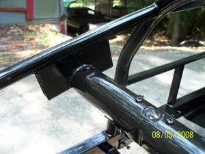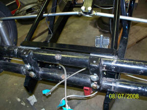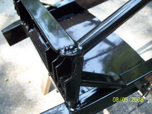 This (barely) shows the caster spacers I made (at the junction of the top beam